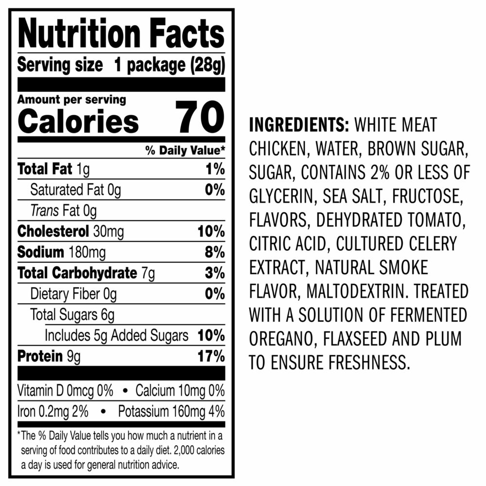 WHITE MEAT CHICKEN, WATER, BROWN SUGAR, SUGAR, CONTAINS 2% OR LESS OF GLYCERIN, SEA SALT, FRUCTOSE, FLAVORS, DEHYDRATED TOMATO, CITRIC ACID, CULTURED CELERY EXTRACT, NATURAL SMOKE FLAVOR, MALTODEXTRIN. TREATED WITH A SOLUTION OF FERMENTED OREGANO, FLAXSEED AND PLUM TO ENSURE FRESHNESS.